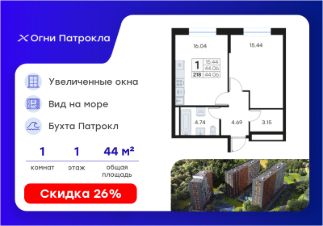 Продается 1-комн. квартира на 1-м этаже в проекте Огни Патрокла от GloraX. Огни Патрокла - уникальный видовой проект с выделяющейся архитектурой в развитом районе Владивостока. Общая площадь лота составляет 44,06 кв. м, из которых 15,44 кв. м отведено под жилую и 16,04 кв. м под кухонную зону. Номер квартиры - 218.