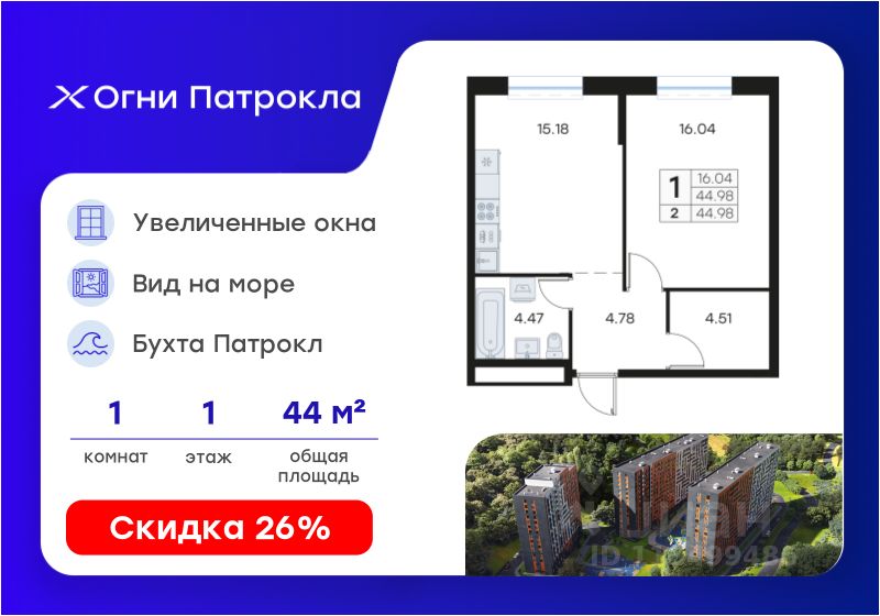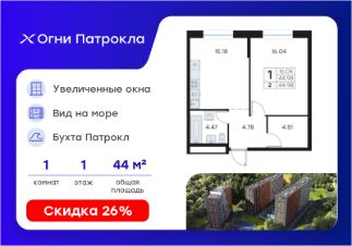 Продается 1-комн. квартира на 1-м этаже в проекте Огни Патрокла от GloraX. Огни Патрокла - уникальный видовой проект с выделяющейся архитектурой в развитом районе Владивостока. Общая площадь лота составляет 44,98 кв. м, из которых 16,04 кв. м отведено под жилую и 15,18 кв. м под кухонную зону. Номер квартиры - 2.