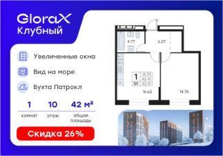 Продается 1-комн. квартира на 10-м этаже в квартале GloraX Клубный. GloraX Клубный - уникальный видовой проект с выделяющейся архитектурой в развитом районе Владивостока. Общая площадь лота составляет 42,41 кв. м, из которых 14,75 кв. м отведено под жилую и 16,62 кв. м под кухонную зону. Номер квартиры - 121.