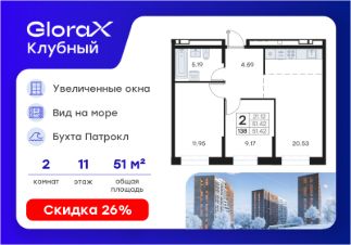 Продается 2-комн. квартира на 11-м этаже в квартале GloraX Клубный. GloraX Клубный - уникальный видовой проект с выделяющейся архитектурой в развитом районе Владивостока. Общая площадь лота составляет 51,42 кв. м, из которых 21,12 кв. м отведено под жилую и 20,53 кв. м под кухонную зону. Номер квартиры - 138.