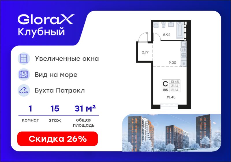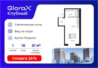 Продается квартира-студия на 15-м этаже в квартале GloraX Клубный. GloraX Клубный - уникальный видовой проект с выделяющейся архитектурой в развитом районе Владивостока. Общая площадь лота составляет 31,14 кв. м, из которых 13,45 кв. м отведено под жилую и 9,00 кв. м под кухонную зону. Номер квартиры - 185.