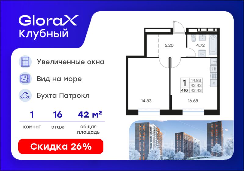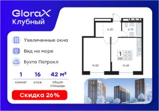 Продается 1-комн. квартира на 16-м этаже в квартале GloraX Клубный. GloraX Клубный - уникальный видовой проект с выделяющейся архитектурой в развитом районе Владивостока. Общая площадь лота составляет 42,43 кв. м, из которых 14,83 кв. м отведено под жилую и 16,68 кв. м под кухонную зону. Номер квартиры - 410.