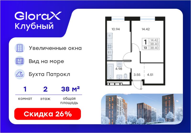 Продается 1-комн. квартира на 2-м этаже в квартале GloraX Клубный. GloraX Клубный - уникальный видовой проект с выделяющейся архитектурой в развитом районе Владивостока. Общая площадь лота составляет 38,40 кв. м, из которых 14,42 кв. м отведено под жилую и 10,94 кв. м под кухонную зону. Номер квартиры - 13.