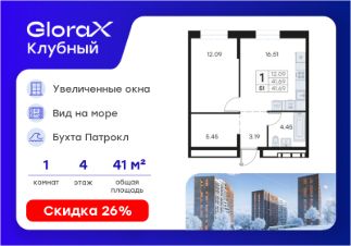 Продается 1-комн. квартира на 4-м этаже в квартале GloraX Клубный. GloraX Клубный - уникальный видовой проект с выделяющейся архитектурой в развитом районе Владивостока. Общая площадь лота составляет 41,69 кв. м, из которых 12,09 кв. м отведено под жилую и 16,51 кв. м под кухонную зону. Номер квартиры - 51.
