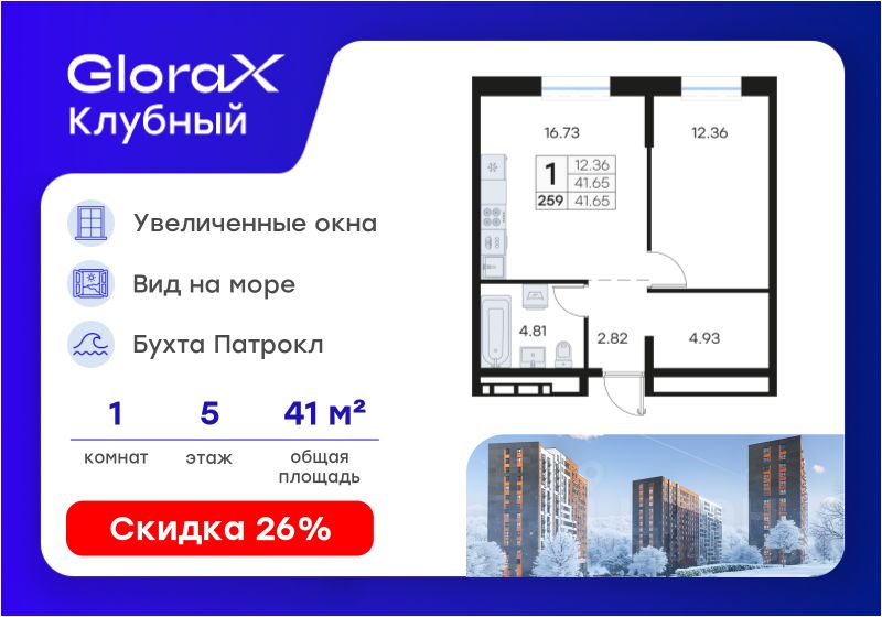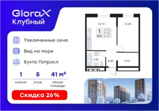 Продается 1-комн. квартира на 5-м этаже в квартале GloraX Клубный. GloraX Клубный - уникальный видовой проект с выделяющейся архитектурой в развитом районе Владивостока. Общая площадь лота составляет 41,65 кв. м, из которых 12,36 кв. м отведено под жилую и 16,73 кв. м под кухонную зону. Номер квартиры - 259.