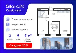 Продается 2-комн. квартира на 5-м этаже в квартале GloraX Клубный. GloraX Клубный - уникальный видовой проект с выделяющейся архитектурой в развитом районе Владивостока. Общая площадь лота составляет 51,42 кв. м, из которых 21,12 кв. м отведено под жилую и 20,53 кв. м под кухонную зону. Номер квартиры - 60.