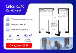 Продается 2-комн. квартира на 6-м этаже в квартале GloraX Клубный. GloraX Клубный - уникальный видовой проект с выделяющейся архитектурой в развитом районе Владивостока. Общая площадь лота составляет 52,65 кв. м, из которых 22,17 кв. м отведено под жилую и 20,18 кв. м под кухонную зону. Номер квартиры - 276.