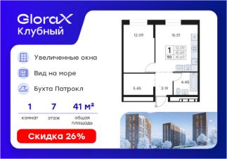 Продается 1-комн. квартира на 7-м этаже в квартале GloraX Клубный. GloraX Клубный - уникальный видовой проект с выделяющейся архитектурой в развитом районе Владивостока. Общая площадь лота составляет 41,69 кв. м, из которых 12,09 кв. м отведено под жилую и 16,51 кв. м под кухонную зону. Номер квартиры - 90.