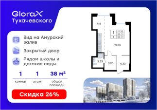Продается квартира-студия на 1-м этаже в жилом комплексе GloraX Тухачевского — современном проекте нового формата в престижном районе Владивостока. Общая площадь лота составляет 38,01 кв. м, из которых 19,38 кв. м отведено под жилую и 7,14 кв. м под кухонную зону. Номер квартиры - 1.