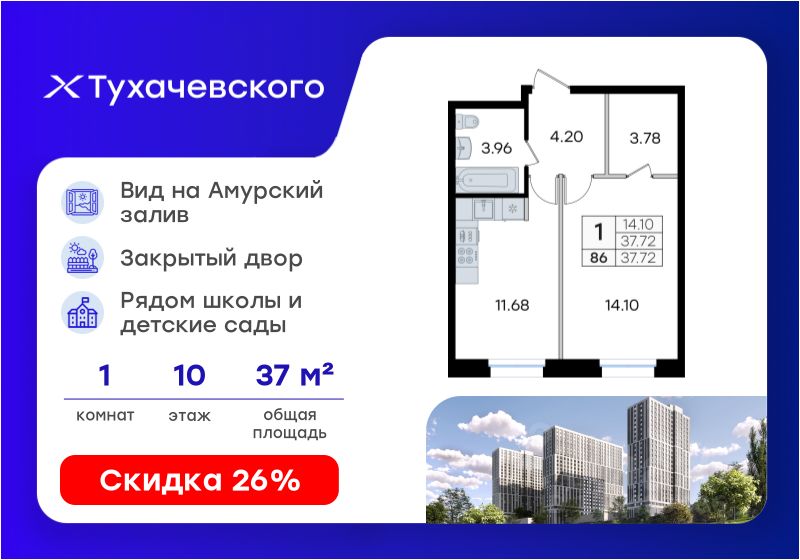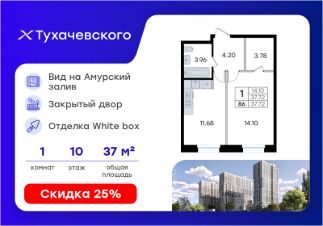 Продается 1-комн. квартира на 10-м этаже в жилом комплексе Тухачевского от GloraX — современном проекте нового формата в престижном районе Владивостока. Общая площадь лота составляет 37,72 кв. м, из которых 14,10 кв. м отведено под жилую и 11,68 кв. м под кухонную зону. Номер квартиры - 86.