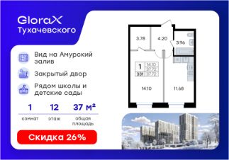 Продается 1-комн. квартира на 12-м этаже в жилом комплексе GloraX Тухачевского — современном проекте нового формата в престижном районе Владивостока. Общая площадь лота составляет 37,72 кв. м, из которых 14,10 кв. м отведено под жилую и 11,68 кв. м под кухонную зону. Номер квартиры - 331.