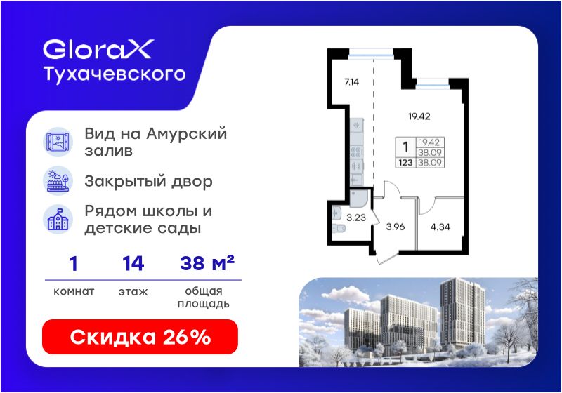Продается квартира-студия на 14-м этаже в жилом комплексе GloraX Тухачевского — современном проекте нового формата в престижном районе Владивостока. Общая площадь лота составляет 38,09 кв. м, из которых 19,42 кв. м отведено под жилую и 7,14 кв. м под кухонную зону. Номер квартиры - 123.