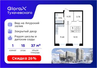 Продается 1-комн. квартира на 15-м этаже в жилом комплексе GloraX Тухачевского — современном проекте нового формата в престижном районе Владивостока. Общая площадь лота составляет 37,72 кв. м, из которых 14,10 кв. м отведено под жилую и 11,68 кв. м под кухонную зону. Номер квартиры - 136.