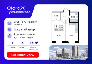 Продается 1-комн. квартира на 16-м этаже в жилом комплексе GloraX Тухачевского — современном проекте нового формата в престижном районе Владивостока. Общая площадь лота составляет 36,68 кв. м, из которых 14,10 кв. м отведено под жилую и 11,68 кв. м под кухонную зону. Номер квартиры - 369.
