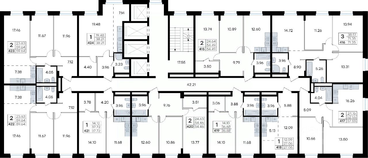 Продается 2-комн. квартира на 21-м этаже в жилом комплексе GloraX Тухачевского — современном проекте нового формата в престижном районе Владивостока. Общая площадь лота составляет 54,49 кв. м, из которых 24,64 кв. м отведено под жилую и 12,60 кв. м под кухонную зону. Номер квартиры - 415.