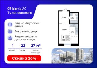 Продается квартира-студия на 22-м этаже в жилом комплексе GloraX Тухачевского — современном проекте нового формата в престижном районе Владивостока. Общая площадь лота составляет 27,06 кв. м, из которых 12,09 кв. м отведено под жилую и 5,13 кв. м под кухонную зону. Номер квартиры - 209.