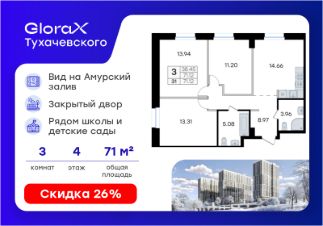 Продается 3-комн. квартира на 4-м этаже в жилом комплексе GloraX Тухачевского — современном проекте нового формата в престижном районе Владивостока. Общая площадь лота составляет 71,12 кв. м, из которых 38,45 кв. м отведено под жилую и 14,66 кв. м под кухонную зону. Номер квартиры - 31.