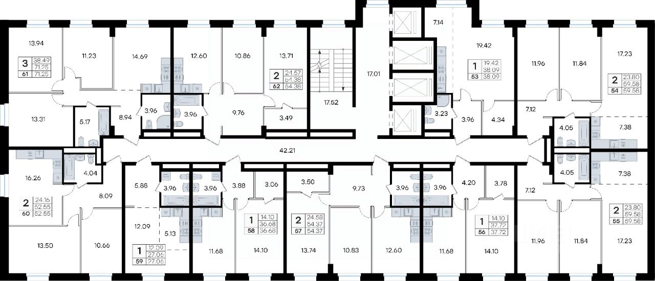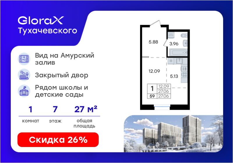Продается квартира-студия на 7-м этаже в жилом комплексе GloraX Тухачевского — современном проекте нового формата в престижном районе Владивостока. Общая площадь лота составляет 27,06 кв. м, из которых 12,09 кв. м отведено под жилую и 5,13 кв. м под кухонную зону. Номер квартиры - 59.