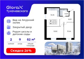 Продается 2-комн. квартира на 9-м этаже в жилом комплексе GloraX Тухачевского — современном проекте нового формата в престижном районе Владивостока. Общая площадь лота составляет 52,55 кв. м, из которых 24,16 кв. м отведено под жилую и 16,26 кв. м под кухонную зону. Номер квартиры - 80.