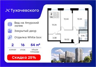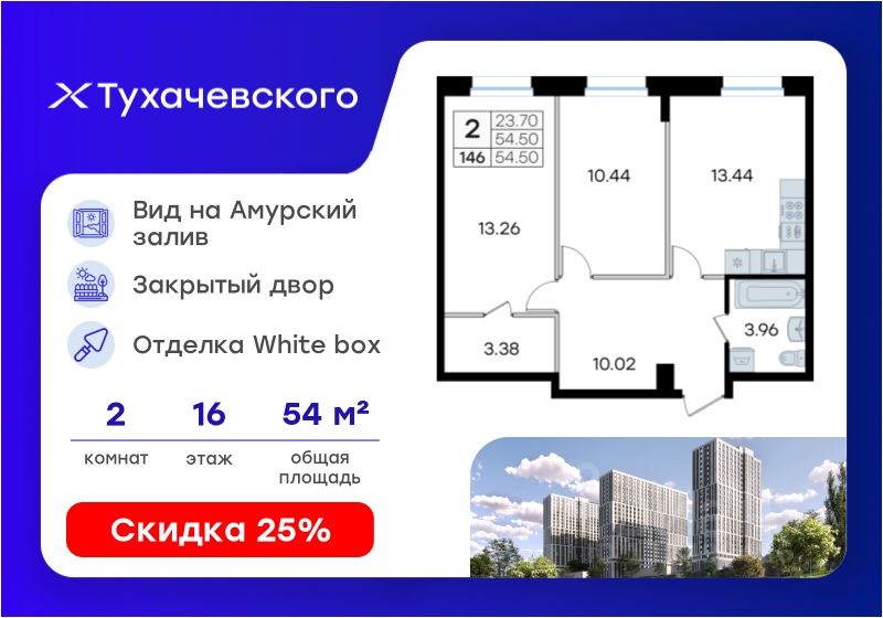 Продается 2-комн. квартира на 16-м этаже в жилом комплексе Тухачевского от GloraX — современном проекте нового формата в престижном районе Владивостока. Общая площадь лота составляет 54,50 кв. м, из которых 23,70 кв. м отведено под жилую и 13,44 кв. м под кухонную зону. Номер квартиры - 146.
