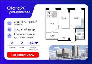 Продается 2-комн. квартира на 2-м этаже в жилом комплексе GloraX Тухачевского — современном проекте нового формата в престижном районе Владивостока. Общая площадь лота составляет 54,26 кв. м, из которых 23,64 кв. м отведено под жилую и 13,38 кв. м под кухонную зону. Номер квартиры - 6.