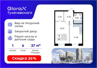 Продается 1-комн. квартира на 6-м этаже в жилом комплексе GloraX Тухачевского — современном проекте нового формата в престижном районе Владивостока. Общая площадь лота составляет 37,72 кв. м, из которых 14,10 кв. м отведено под жилую и 11,68 кв. м под кухонную зону. Номер квартиры - 52.