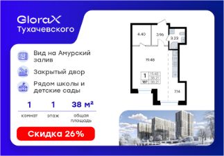 Продается квартира-студия на 1-м этаже в жилом комплексе GloraX Тухачевского — современном проекте нового формата в престижном районе Владивостока. Общая площадь лота составляет 38,21 кв. м, из которых 19,48 кв. м отведено под жилую и 7,14 кв. м под кухонную зону. Номер квартиры - 187.