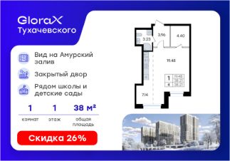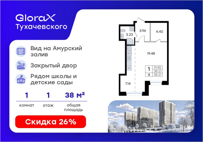 Продается квартира-студия на 1-м этаже в жилом комплексе GloraX Тухачевского — современном проекте нового формата в престижном районе Владивостока. Общая площадь лота составляет 38,21 кв. м, из которых 19,48 кв. м отведено под жилую и 7,14 кв. м под кухонную зону. Номер квартиры - 4.
