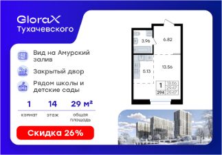 Продается квартира-студия на 14-м этаже в жилом комплексе GloraX Тухачевского — современном проекте нового формата в престижном районе Владивостока. Общая площадь лота составляет 29,47 кв. м, из которых 13,56 кв. м отведено под жилую и 5,13 кв. м под кухонную зону. Номер квартиры - 294.