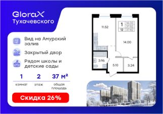 Продается 1-комн. квартира на 2-м этаже в жилом комплексе GloraX Тухачевского — современном проекте нового формата в престижном районе Владивостока. Общая площадь лота составляет 37,82 кв. м, из которых 14,00 кв. м отведено под жилую и 11,52 кв. м под кухонную зону. Номер квартиры - 12.