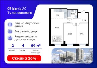 Продается 2-комн. квартира на 4-м этаже в жилом комплексе GloraX Тухачевского — современном проекте нового формата в престижном районе Владивостока. Общая площадь лота составляет 59,63 кв. м, из которых 23,97 кв. м отведено под жилую и 7,38 кв. м под кухонную зону. Номер квартиры - 208. Преимущества квартиры: двухкомнатная квартира. Преимущества проекта: • Панорамный вид на Амурский залив и зелёные сопки • Удачное расположение и транспортная доступность: Первореченский район, 20 минут до центра города • Закрытая охраняемая территория с доступом только для жителей • Эксклюзивное благоустройство: продуманное зонирование, игровые и спортивные площадки, арт-инсталляция, Тайный сад • Безбарьерная среда, видеонаблюдений, Wi-Fi на территории • Премиальный дизайн входных групп реcепшн и лаунж-зоной • Лапомойки, колясочные и туалеты на первом этаже • Подземный паркинг на 449 машиномест с доступом на лифте с жилых этажей • Индивидуальные кладовые на цокольном этаже от 2 до 10 м2 GloraX Тухачевского — это городское пространство нового формата, которое позволяет современным горожанам находить все необходимые атрибуты комфортной жизни внутри своего жилого комплекса. Весь комплекс спроектирован так, чтобы жить здесь было удобно и безопасно: светлые лаунж-зоны и ресепшн на входах в жилые корпуса, эксклюзивный дизайн мест общего пользования и придомовой территории, круглосуточная охрана, видеонаблюдение и даже детский сад в одном из корпусов все, что необходимо современному городскому жителю. GloraX Тухачевского находится в одном из самых престижных районов города с хорошей, давно сформировавшейся инфраструктурой и отличной транспортной доступностью. Отсюда легко добраться до центра города, других районов и даже пригорода как на собственном транспорте, так и на общественном. Квартал имеет прямой выезд на ул. Тухачевского, а рядом с комплексом расположена автобусная остановка на несколько маршрутов. Проект состоит из 3 монолитных корпусов, объединенных единым стилобатом. В комплексе предусмотрены: подземный паркинг с лифтом на жилые этажи, кладовые для хранения, благоустроенный двор без машин, детские и спортивные площадки, зоны для отдыха и прогулок. Эксклюзивный проект благоустройства территории разработан одной из лучших студий ландшафтного дизайна DEREVOPARK с фокусом на комфорт и удобство для всех жителей комплекса. Вся необходимая инфраструктура — магазины, школы, детские сады, остановки общественного транспорта — находится рядом. Узнайте подробности и подберите свою квартиру в GloraX Тухачевского — в отделе продаж уже сегодня. Цена указана при 100% оплате или стандартной ипотеке без субсидий. Узнайте подробности в Отделе продаж.