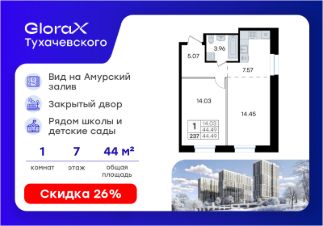 Продается 1-комн. квартира на 7-м этаже в жилом комплексе GloraX Тухачевского — современном проекте нового формата в престижном районе Владивостока. Общая площадь лота составляет 44,49 кв. м, из которых 14,03 кв. м отведено под жилую и 7,57 кв. м под кухонную зону. Номер квартиры - 237.