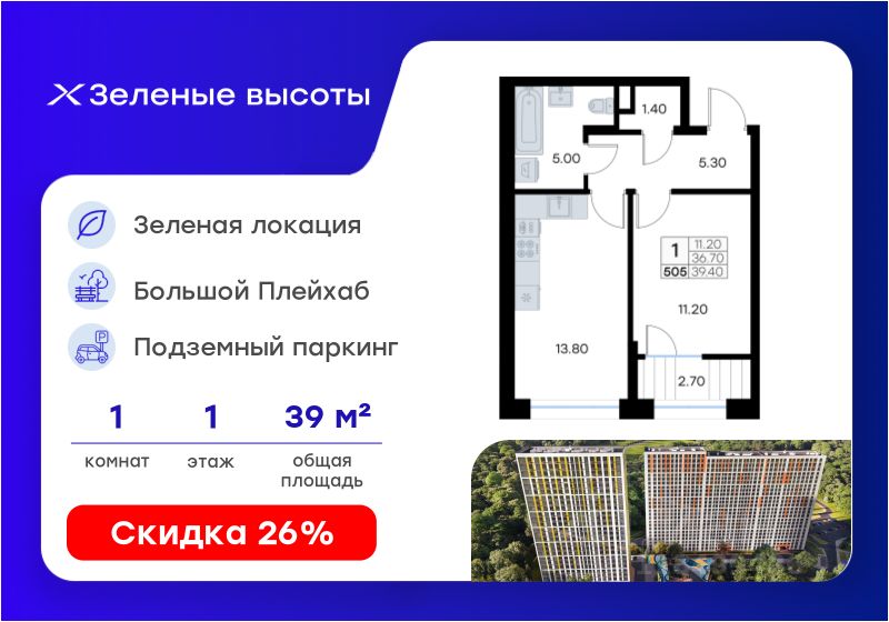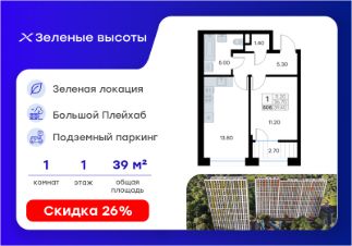 Продается 1-комн. квартира на 1-м этаже в жилом квартале Зелёные высоты от GloraX — проекте в тихой зелёной локации. Общая площадь квартиры 39,40 кв. м, из которых 11,20 кв. м включая 11,20 кв. м жилого пространства и 13,80 кв. м кухни. Номер квартиры - 505.
