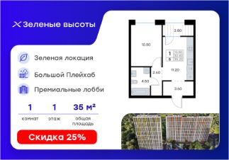 Продается 1-комн. квартира на 1-м этаже в жилом квартале Зелёные высоты от GloraX — проекте в тихой зелёной локации. Общая площадь квартиры 35,20 кв. м, из которых 10,50 кв. м включая 10,50 кв. м жилого пространства и 11,20 кв. м кухни. Номер квартиры - 5.