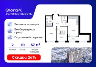 Продается 2-комн. квартира на 10-м этаже в жилом квартале GloraX Зелёные высоты — проекте в тихой зелёной локации. Общая площадь квартиры 57,60 кв. м, из которых 20,70 кв. м включая 20,70 кв. м жилого пространства и 15,00 кв. м кухни. Номер квартиры - 339.