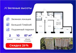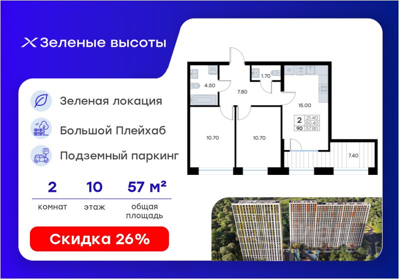 Продается 2-комн. квартира на 10-м этаже в жилом квартале Зелёные высоты от GloraX — проекте в тихой зелёной локации. Общая площадь квартиры 57,80 кв. м, из которых 21,40 кв. м включая 21,40 кв. м жилого пространства и 15,00 кв. м кухни. Номер квартиры - 90.