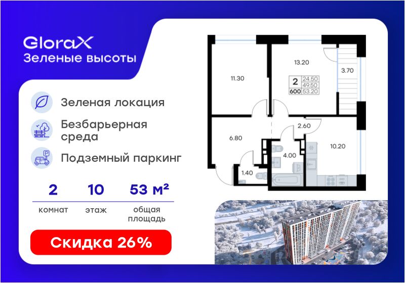 Продается 2-комн. квартира на 10-м этаже в жилом квартале GloraX Зелёные высоты — проекте в тихой зелёной локации. Общая площадь квартиры 53,20 кв. м, из которых 24,50 кв. м включая 24,50 кв. м жилого пространства и 10,20 кв. м кухни. Номер квартиры - 600.