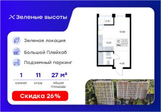 Продается квартира-студия на 11-м этаже в жилом квартале Зелёные высоты от GloraX — проекте в тихой зелёной локации. Общая площадь квартиры 27,70 кв. м, из которых 13,80 кв. м включая 13,80 кв. м жилого пространства и 3,60 кв. м кухни. Номер квартиры - 356.