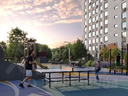 Территория жилого квартала благоустроена и включает игровые зоны и спортивные площадки для детей различных возрастных групп, уютные зоны отдыха со скамейками и универсальную воркаут-площадку для активного досуга.