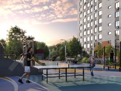 Территория жилого квартала благоустроена и включает игровые зоны и спортивные площадки для детей различных возрастных групп, уютные зоны отдыха со скамейками и универсальную воркаут-площадку для активного досуга.
