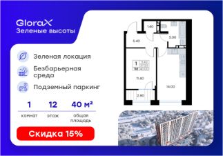 Продается 1-комн. квартира на 12-м этаже в жилом квартале GloraX Зелёные высоты — проекте в тихой зелёной локации. Общая площадь квартиры 40,00 кв. м, из которых 11,40 кв. м включая 11,40 кв. м жилого пространства и 14,00 кв. м кухни. Номер квартиры - 118.