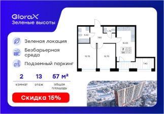 Продается 2-комн. квартира на 13-м этаже в жилом квартале GloraX Зелёные высоты — проекте в тихой зелёной локации. Общая площадь квартиры 57,80 кв. м, из которых 21,40 кв. м включая 21,40 кв. м жилого пространства и 15,00 кв. м кухни. Номер квартиры - 120.