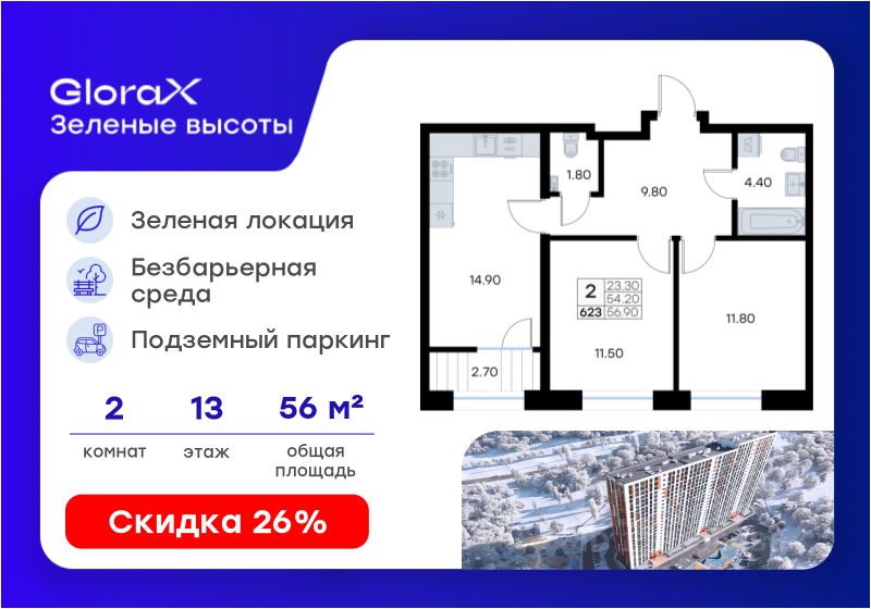 Продается 2-комн. квартира на 13-м этаже в жилом квартале GloraX Зелёные высоты — проекте в тихой зелёной локации. Общая площадь квартиры 56,90 кв. м, из которых 23,30 кв. м включая 23,30 кв. м жилого пространства и 14,90 кв. м кухни. Номер квартиры - 623.
