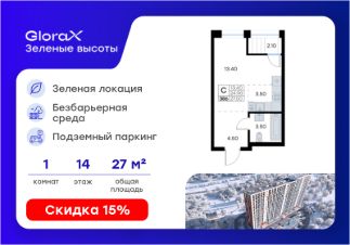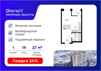 Продается квартира-студия на 14-м этаже в жилом квартале GloraX Зелёные высоты — проекте в тихой зелёной локации. Общая площадь квартиры 27,00 кв. м, из которых 13,40 кв. м включая 13,40 кв. м жилого пространства и 3,50 кв. м кухни. Номер квартиры - 386.
