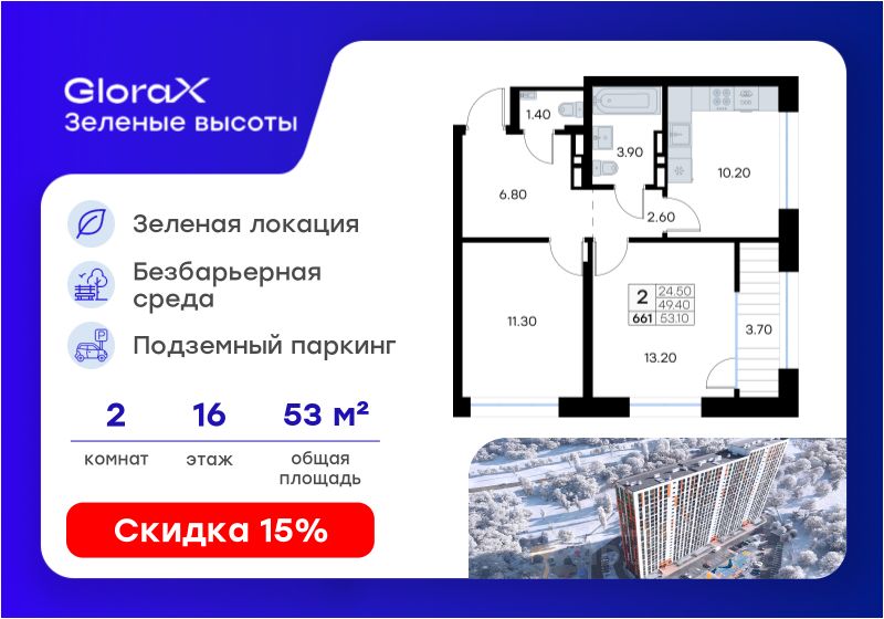 Продается 2-комн. квартира на 16-м этаже в жилом квартале GloraX Зелёные высоты — проекте в тихой зелёной локации. Общая площадь квартиры 53,10 кв. м, из которых 24,50 кв. м включая 24,50 кв. м жилого пространства и 10,20 кв. м кухни. Номер квартиры - 661.