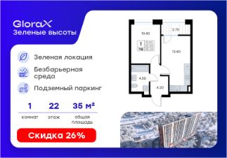 Продается 1-комн. квартира на 22-м этаже в жилом квартале GloraX Зелёные высоты — проекте в тихой зелёной локации. Общая площадь квартиры 35,20 кв. м, из которых 10,40 кв. м включая 10,40 кв. м жилого пространства и 13,40 кв. м кухни. Номер квартиры - 718.