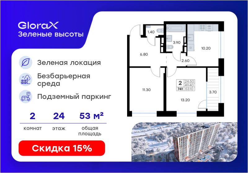 Продается 2-комн. квартира на 24-м этаже в жилом квартале GloraX Зелёные высоты — проекте в тихой зелёной локации. Общая площадь квартиры 53,10 кв. м, из которых 24,50 кв. м включая 24,50 кв. м жилого пространства и 10,20 кв. м кухни. Номер квартиры - 741.