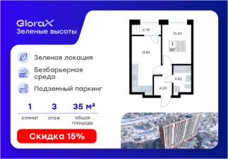 Продается 1-комн. квартира на 3-м этаже в жилом квартале GloraX Зелёные высоты — проекте в тихой зелёной локации. Общая площадь квартиры 35,60 кв. м, из которых 10,40 кв. м включая 10,40 кв. м жилого пространства и 13,80 кв. м кухни. Номер квартиры - 527.