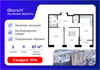 Продается 2-комн. квартира на 9-м этаже в жилом квартале GloraX Зелёные высоты — проекте в тихой зелёной локации. Общая площадь квартиры 57,80 кв. м, из которых 23,70 кв. м включая 23,70 кв. м жилого пространства и 15,10 кв. м кухни. Номер квартиры - 89.