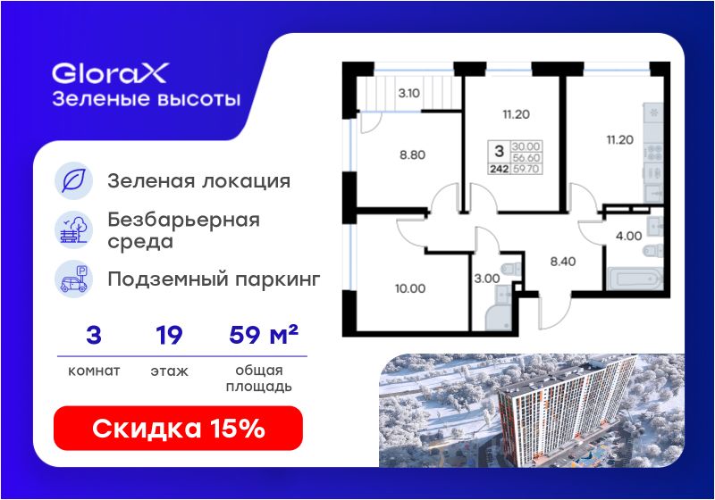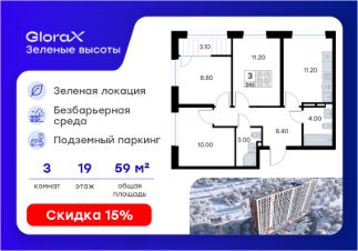 Продается 3-комн. квартира на 19-м этаже в жилом квартале GloraX Зелёные высоты — проекте в тихой зелёной локации. Общая площадь квартиры 59,70 кв. м, из которых 30,00 кв. м включая 30,00 кв. м жилого пространства и 11,20 кв. м кухни. Номер квартиры - 242.